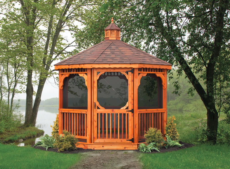 (shown on left) 10' Cedar Octagon, Octagon Asphalt Shingles, 2x2 Square Rails, Screens, and Cedar Stain