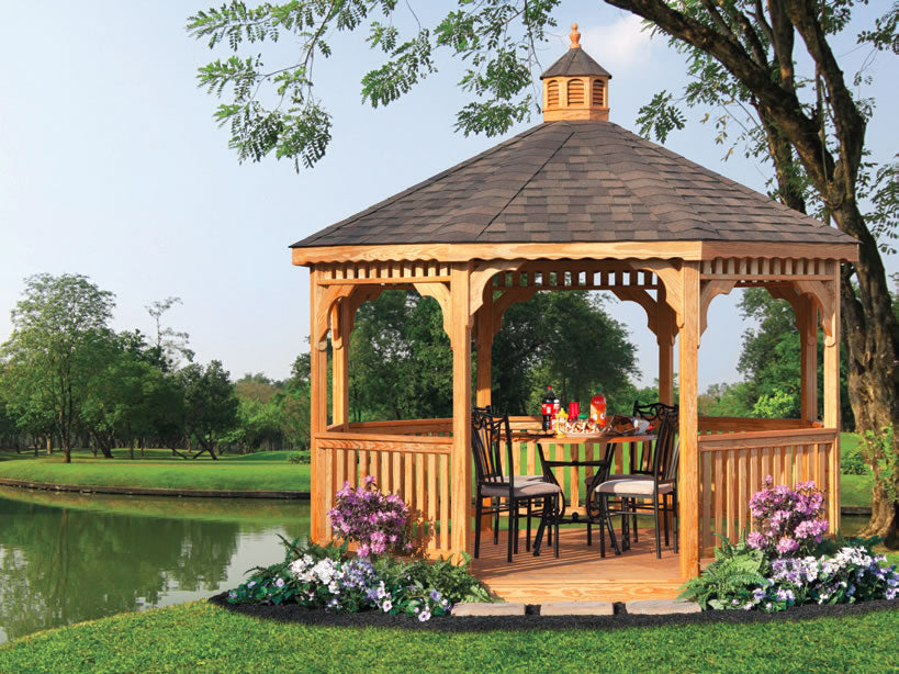 The perfect shape for dining and larger gatherings, our wood oval gazebos provide shelter from the sun while bringing family and friends together in style. With a choice of sizes, as well as rails, screens and other details, your oval gazebo will be handcrafted to meet your needs and tastes. Choose our pagoda roof style for added elegance that makes this gazebo a beautiful setting for special occasions.